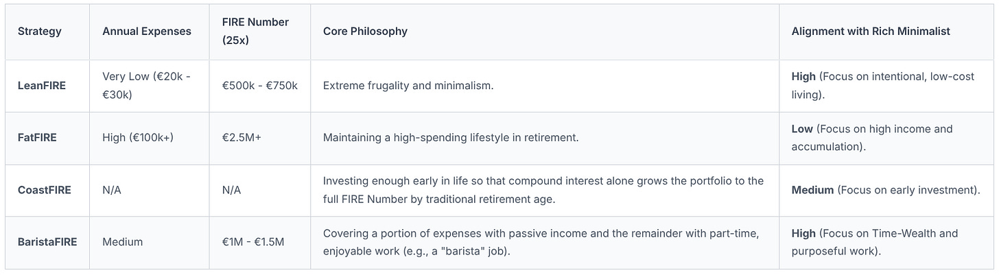 So, FIRE is a spectrum and it depends on your preferences where on that spectrum you feel comfortable. The Rich Minimalist philosophy aligns most closely with LeanFIRE and BaristaFIRE, emphasizing that a lower expense base is the fastest and most reliable path to freedom.