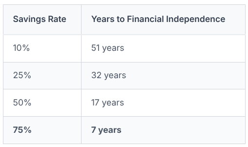 The single most important factor in achieving FIRE is your Savings Rate—the percentage of your net income (=after-tax income minus expenses) that you save and invest. A high savings rate dramatically reduces the time it takes to reach your FIRE Number.