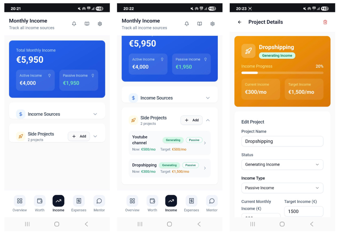 This is one reason I built the Financial Freedom Mentor app in the first place. I wanted to see my own financial life more clearly. Then I realized that if it helped me, it might help others too. That’s usually a good sign you’re onto something useful. In the Income Section you can track and manage all sorts of income and in particular the effectiveness of side projects.