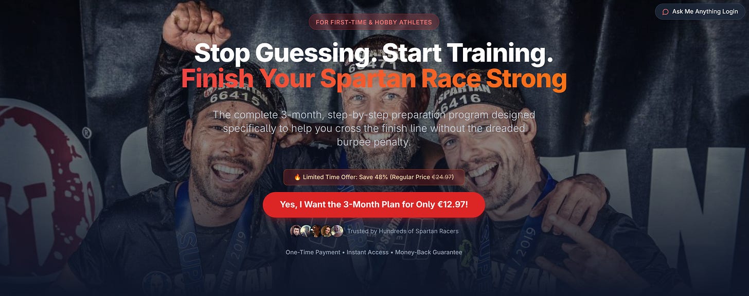 The Spartan Race Preparation Program is another good example. It comes from a real interest and a real personal experience. It’s not fake guru content. I completed nice Spartan races and initially found it challenging to prepare effectively. So, I developed this program to share my experience of what works related to training intensity, the right exercises, nutrition, recovery and crucial race day do’s and dont’s. When a project comes from real life, it tends to be more authentic, easier to explain, and more useful to others.
